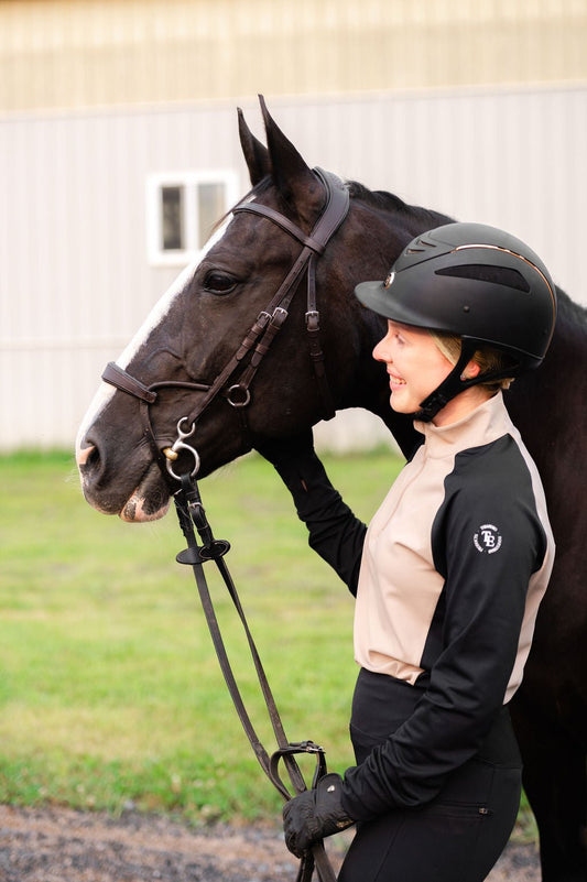 My first thought when I tried on my Café au Lait baselayer was “oh my goodness this is the softest thing I’ve ever worn!” The feel is similar to a “scuba” fabric. I also could not get over the fact that the sleeves are actually long enough on me. At 6’2” I rarely find riding tops that are actually long enough. I always end up rolling up my sleeves. But THIS top?! No issue whatsoever. I cannot wait for the spring/summer collection!