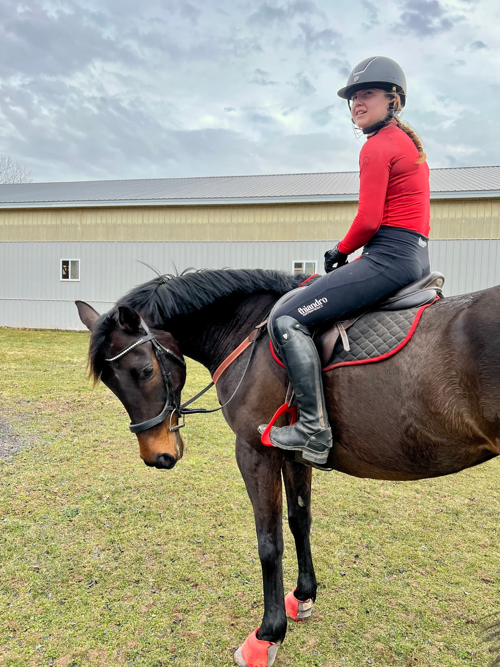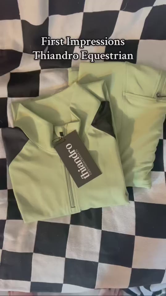 I am absolutely obsessed with the Thiandro Black Essential Riding Tights. These tights are so flattering with the wide waistband to keep my tummy in check. Plus, as a short human being with long legs, I am in love with how long the legs. Usually I have a hard time finding things that fit my smaller waist but are long enough for my legs and these riding tights are perfect! Plus, the phone pocket one either side is zippered, which I love because I have had my phone slip out of a non-zippered pocket before. I am 5’ 2” and ~135lbs and the size small is perfect for me! I usually am hesitant to buy a small when it comes to riding clothes because even though that’s what I wear in non-riding clothes, the equestrian stuff always seems to run so small, but Thiandro’s true to size!